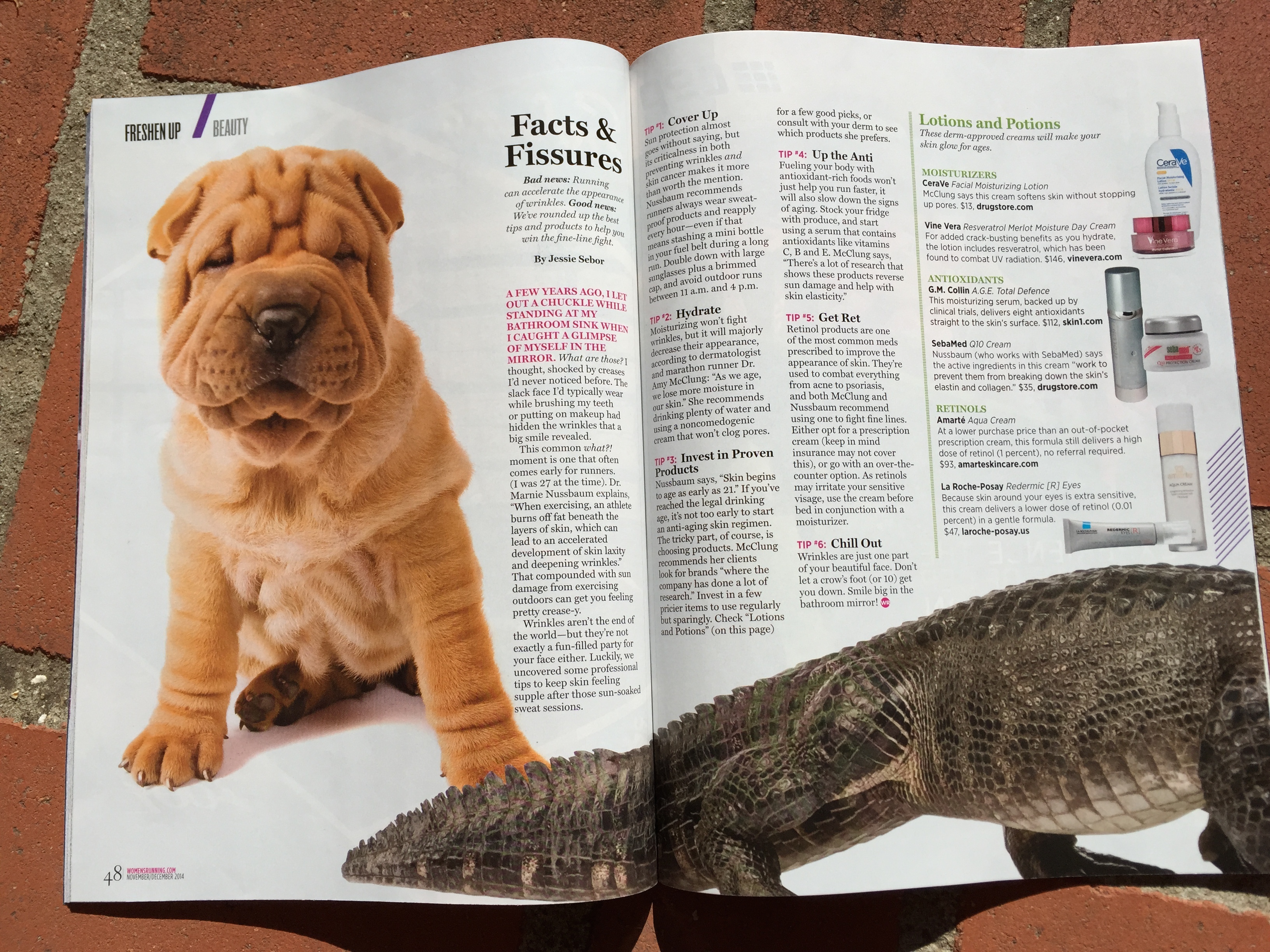 Dr. Amy McClung and other specialists share products and strategies to reduce the appearance of wrinkles. The article in Women’s Running, Facts and Fissures, explains that those who run are more prone to rapidly appearing wrinkles due to reduced fat and increased skin laxity. While there are some simple fixes such as staying hydrated, there are also specific wrinkle reducing products such as retinols, antioxidants, and moisturizers listed.